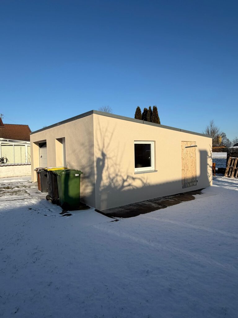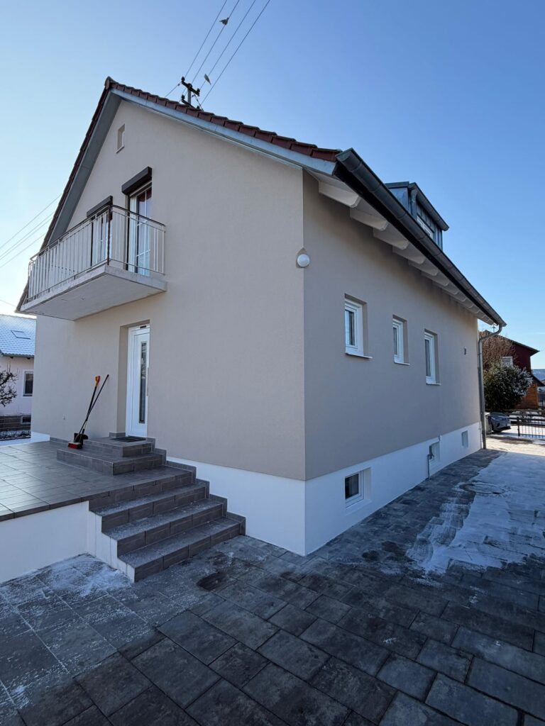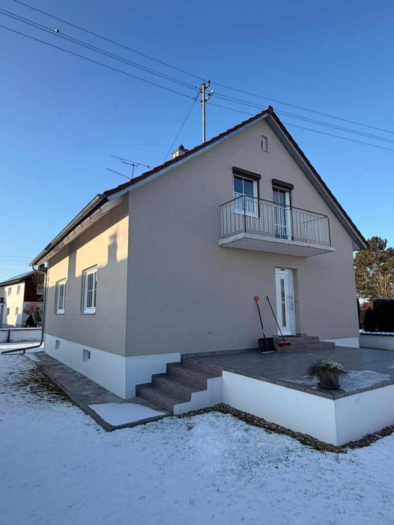 In Reichertshofen wurde die Fassade eines Wohnhauses inklusive Garage umfassend saniert. Aufgrund der unzureichenden Haftung der bestehenden Altbeschichtung war es erforderlich, die alte Fassadenfarbe vollständig mechanisch abzuschleifen und den Untergrund fachgerecht vorzubereiten.
